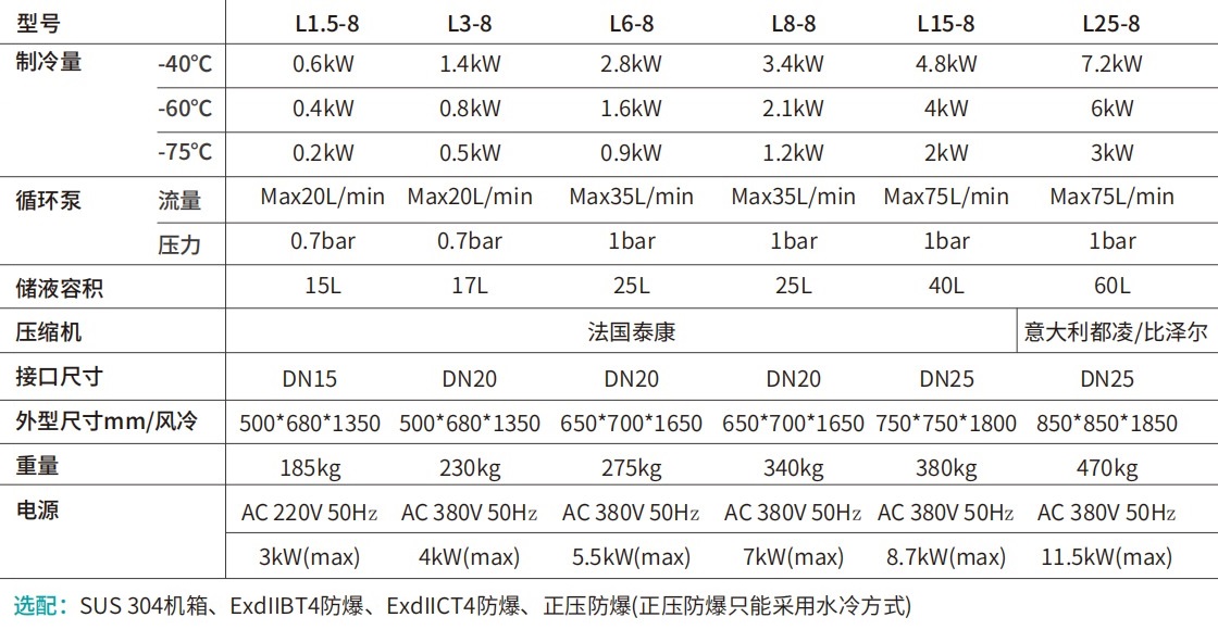 | 型號 | 制冷量 | 循環泵 | 儲液容積 | 壓縮機 | 接口尺寸 | 外型尺寸mm/風冷 | 重量 | 電源 | ||||