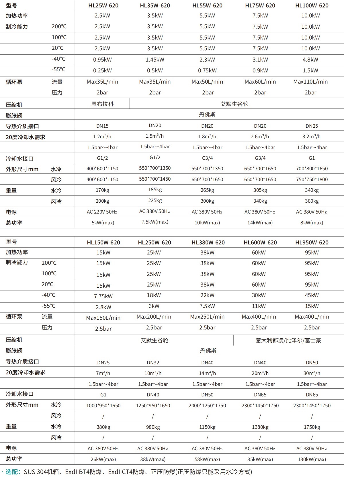 | HL600W-620 | 60kW | 60kW | 60kW | 60kW | 30kW | 11kW | Max400L/min | 2.5bar | 意大利都凌/比澤爾/富士豪 | 丹佛斯 | DN40 | 20m3/h | 1.5bar~4bar | DN65 | 2300*1450*1750 | / | 1380kg | / | AC 380V 50Hz | 85kW(max) |